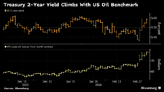 随着基准原油期货合约自去年6月以来首次突破每桶78美元,各期限美债收益率上涨2至5个基点。自2月28日美国袭击伊朗以来,油价本周从70美元下方一路飙升,交易员押注美联储今年将推迟降息。