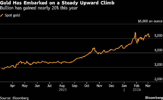 受地缘政治与贸易紧张局势加剧,以及对美联储独立性担忧的支撑,黄金今年以来已上涨约五分之一。金价在1月下旬创下每盎司5595美元以上的历史新高。