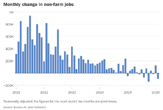 今年年初,就业市场开局平稳,1 月新增 13 万个就业岗位,这一数字已接近 2025 年全年的新增就业总量 ——2025 年是疫情以来就业增长最弱的一年。