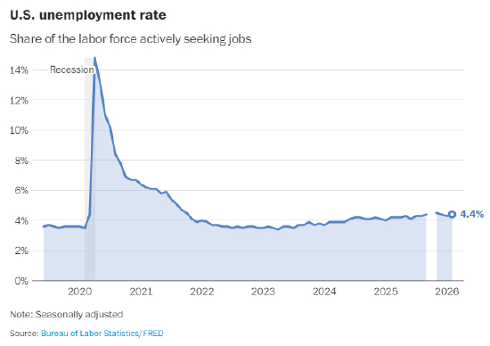 美国劳工统计局最新数据显示,失业率升至 4.4%。
