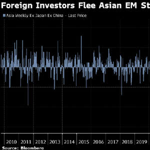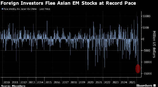 彭博汇编的数据,外国投资者上周从不包括中国的新兴市场亚洲股市撤出了142亿美元,为至少自2009年以来最大。抛售集中在以半导体为主的韩国和台湾,这两个市场已成为全球人工智能相关投资的主要目的地。