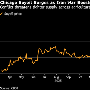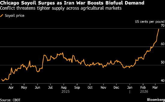 此次冲突造成的原油供应中断,提升了以农作物为原料的生物燃料的吸引力,进而推高了植物油与玉米的需求。作为化肥贸易主要通道的霍尔木兹海峡实际上已被封锁,这也导致化肥价格飙升,农户纷纷急于备货。与此同时,战时粮食安全担忧可能促使部分国家增加小麦等主粮的储备。