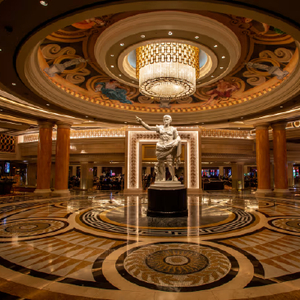 凯撒皇宫酒店及赌场主入口,中央矗立着尤利乌斯・凯撒巨型雕像,背景可见角子机。