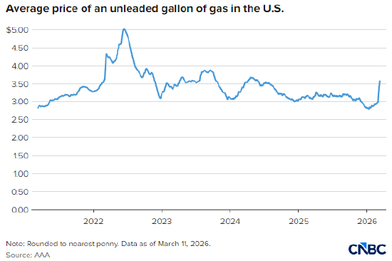 - 美国汽车协会(AAA)数据显示,过去一个月无铅汽油均价飙升约 22%,创下 2024 年年中以来的最高水平。