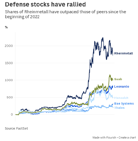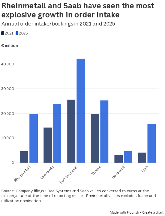 - 莱茵金属、莱昂纳多、BAE 系统、法国泰雷兹、德国亨索尔特、瑞典萨博的年均营收平均增长 57%;