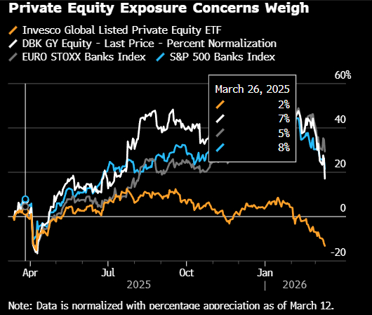 与此同时,欧洲银行股指数下跌3.5%。德意志银行以5.3%的跌幅领跌。此前该银行披露其对私募信贷的敞口高达260亿欧元(300亿美元),而私募信贷这一资产类别正面临赎回压力。