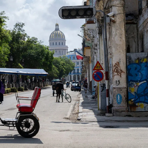 2026 年 3 月 4 日,哈瓦那,一辆三轮车驶过因停电而失灵的交通信号灯。