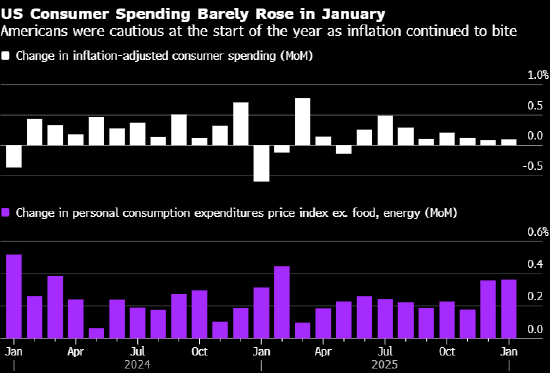 美国1月消费者支出几无增长 通胀则在高位