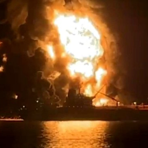 一艘油轮在伊拉克水域遭袭后起火燃烧。