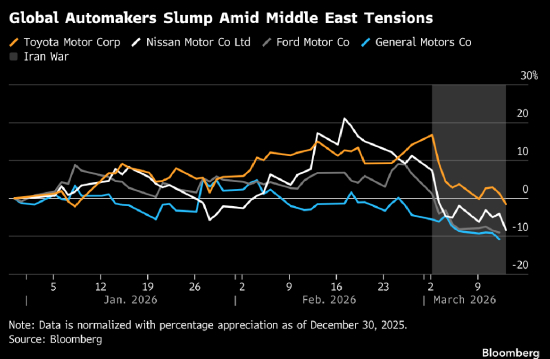 伯恩斯坦分析师Eunice Lee等指出,丰田、现代受中东销量下滑冲击最大,该地区分别占其总销量的17%和10%。本月现代股价暴跌23%,丰田下跌12%。