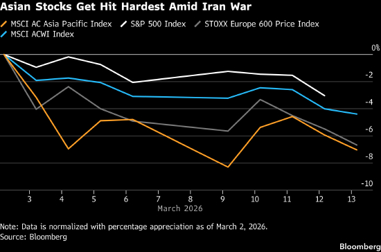 冲突开始以来,全球股市已下跌5.5%,正迎来2022年以来最差月度表现,亚洲受冲击最严重。交易员担心通胀反弹、战争成本加剧财政赤字,已将美联储下一次降息预期推迟至2027年年中。