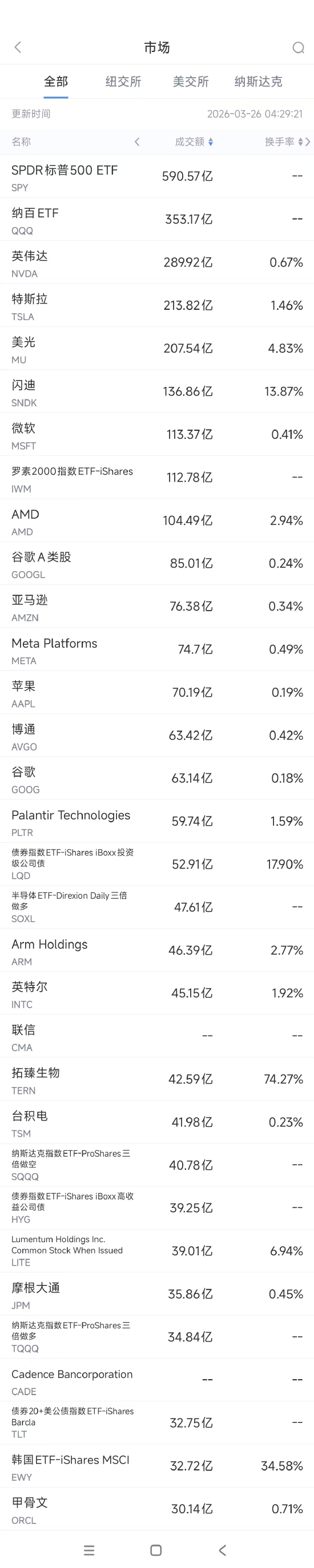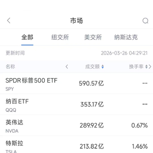 第4名闪迪收跌3.5%,成交136.86亿美元。根据2026年3月25日的市场消息,闪迪宣布投资10亿美元,收购南亚科技约1.39亿股股份,此次交易预计将使闪迪获得南亚科技约3.9%的股权。