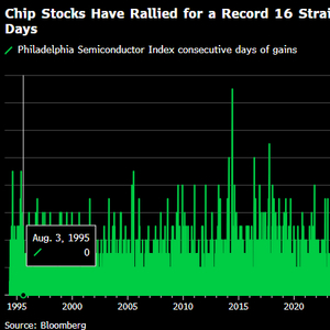 一项追踪半导体股票的指数有望创下有史以来最长的日连涨纪录,因投资者押注人工智能相关需求将推动该行业实现强劲增长。