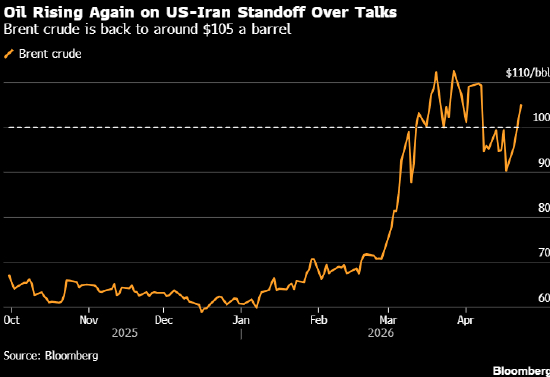 随着围绕霍尔木兹海峡及封锁的紧张局势加剧,布伦特原油周四升至约每桶105美元。美国表示,美军在印度洋登上一艘运载伊朗石油的超级油轮,而伊朗周三向船只开火并扣押了两艘船。
