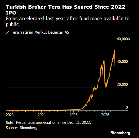 然而,随着去年时间的推移,Tera Yatirim Menkul Degerler AS的股价涨势依旧,且幅度惊人——出现54%、108%、61%和73%的月度涨幅。即使在土耳其这个长久以来的投机狂热温床,Tera股价飙升的速度和幅度也令投资者咋舌:自2022年Tera首次公开募股以来累计涨幅已接近40,000%,外界也极为好奇似乎是推动这波股价上涨的金融炼金术。