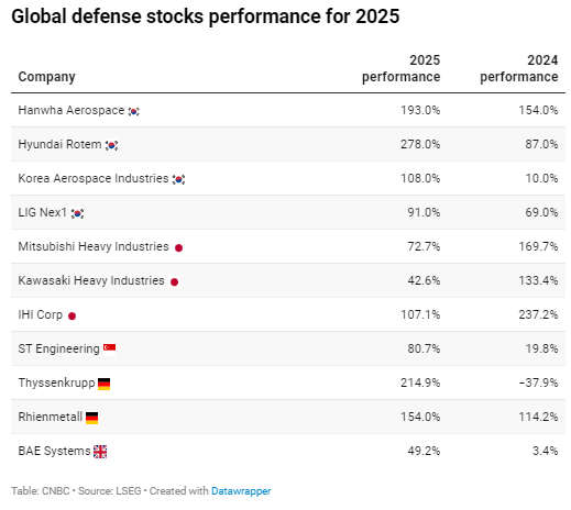 其他军工企业如 K2 主战坦克制造商现代 Rotem、防空系统制造商 LIG Nex1,2025 年股价分别上涨 278% 和 91%。