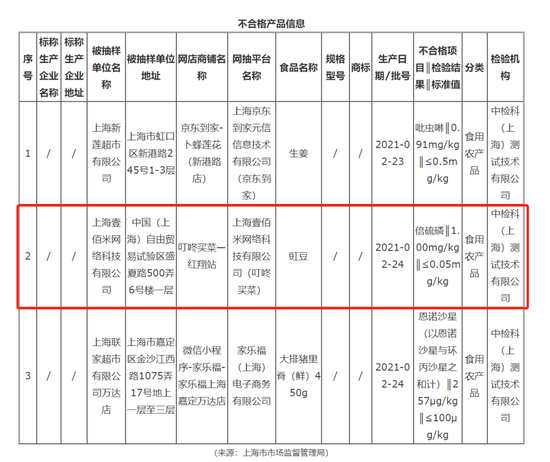 每日优鲜是食品安全黑名单的常客。最近的5月25日,上海市市场监管局公布的2021年第19期省级食品安全抽检信息显示,(网抽平台)北京每日优鲜电子商务有限公司(每日优鲜)销售的“豇豆”(生产日期/批号:2021/2/24),经检验,倍硫磷(检出值:0.54mg/kg;标准值:≤0.05mg/kg)、灭蝇胺(检出值:2.4mg/kg;标准值:≤0.5mg/kg)均超标。