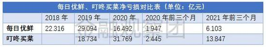 而叮咚买菜在两年零一个季度里,累计亏损64.35亿元。仅计算2019年至2021年前三个月这两年多,两家合计亏损额为116亿元。