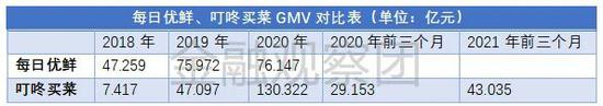 市场数据也显示,每日优鲜的头部地位在下滑。每日优鲜招股书援引艾瑞咨询数据称,2018年和2019年前者GMV分别位居中国按需DMW零售行业第一,2020年位居第二。