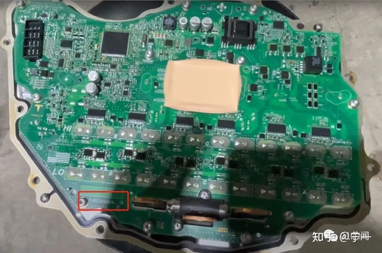 Model S Plain后驱逆变器,可见驱动与控制板上红框处的 “Model 3” 标记(来源:Ingineerix)