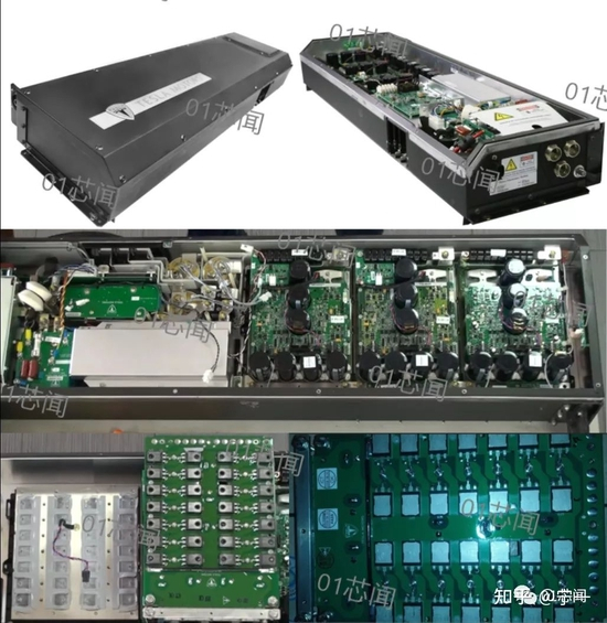 其次,IGBT单管的布局和散热方式有了重大改变。每个半桥上下桥臂中的IGBT单管背靠背通过低温焊接固定在散热器上,并用夹具进一步加强,组成类似三明治的结构。与LDU相比,不仅半桥之间组成立体结构,半桥之内上下桥臂也为立体结构,充分利用了空间,同时低温焊接使得散热更好。现在一些半导体供应商的双面水冷散热模块也是采用类似的散热设计提高功率密度。