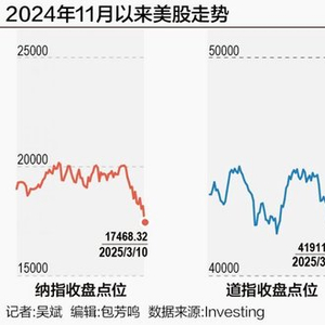 然而,短短不到一个月,形势便急转直下,特朗普的关税政策让全球投资者感到恐慌,市场对经济下滑的担忧推动股市抛售。美国东部时间3月10日,三大指数均大跌超2%,纳指暴跌4%,标普500指数从上个月的峰值跌去了四万亿美元。