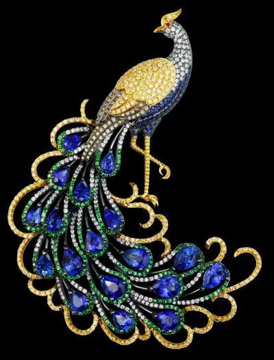 凤凰的王者风范,一人之下万人之上,英挺姿态展现霸主的刚强气度,身披华丽羽翼,回头检视尾羽的艳丽,凤凰回眸并顺势甩动尾羽的力道拿捏恰当,充分表达了力与美。设计师运用多种宝石,特色表现宝石定位,渐层镶嵌与精致的排列,使产品达到艺术的境界。