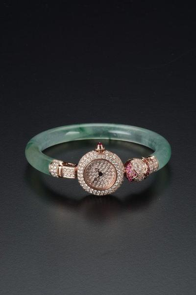 老式玉镯的新生,化身为一只精致的玉镯表。以种水俱佳的玉镯镶上18K玫瑰金制成的手工表,表身即为开关,赋予作品更完整的主体性,不同以往玉镯的形象,同时拥有翡翠的温润之美与珠宝表的精致工艺,是非常实用且华丽优雅的玉镯表。