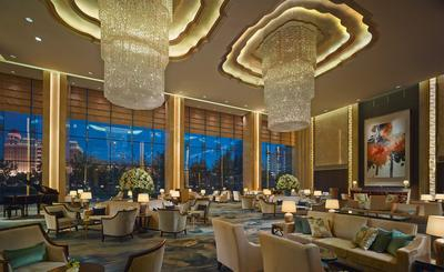 在大堂酒廊,客人可以透过超大落地窗欣赏海河美景。在酒店的设计中也处处体现着河流元素——大堂酒廊的水晶吊灯就仿佛阳光照耀之下波光粼粼的海河河面;地毯图案则是美丽的睡莲静静地躺在蓝色的水面上;大堂和大堂酒廊之间的隔断上雕刻着从树上垂下的含苞待放的金色花朵,仿佛清风徐来时落花正欲入水。