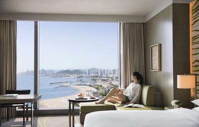大连君悦酒店拥有370间客房,房间面积45平方米至225平方米不等,宽敞的空间让入住变得更为舒适自在。全景式落地窗吸纳充沛的自然光,并可欣赏到星海湾的广阔海景。房间设有智能电动窗帘,当您进入房间时,窗帘将自动收起,为您展现醉人海景。