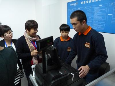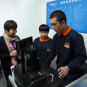北京百年职校学生正在“沃尔玛零售人才专业培训课程实习室”学习收银系统及收银员工作操作