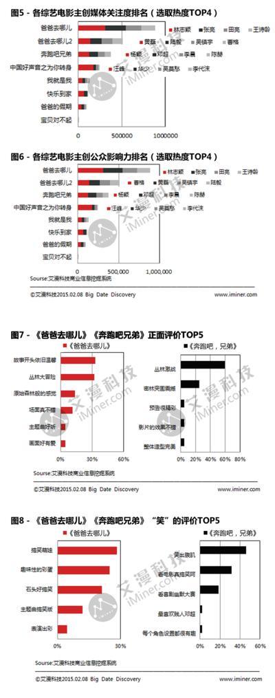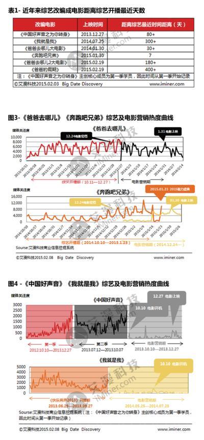 北京2015年2月12日电 /美通社/ -- 继2014年根据综艺节目《爸爸去哪儿》品牌所衍生的《爸爸去哪儿》大电影创下6.9亿元票房后,2015年《奔跑吧兄弟》电影版再创“综艺改编电影“的票房奇迹,当前为止,已累计票房3.5亿。但“临阵磨枪拍了6天就仓促上阵”、“没有故事情节”“毫无制作水准”“直接将一期综艺特别节目搬上大荧幕”…所有这些都令业界人唏嘘不已,表示看不懂中国电影市场了,综艺电影如今就如同电影市场的一个“怪胎”,虽然长相奇怪,但是却强壮而有力,生下来便将其他电影远远甩在起跑线上,以自己与生俱来的优势抢食着中国电影市场的份额。为什么综艺电影生命力如此强大,为什么也有大量胎死腹中的综艺电影?通过艾漫科技的数据来窥探它成长强大的端倪 --