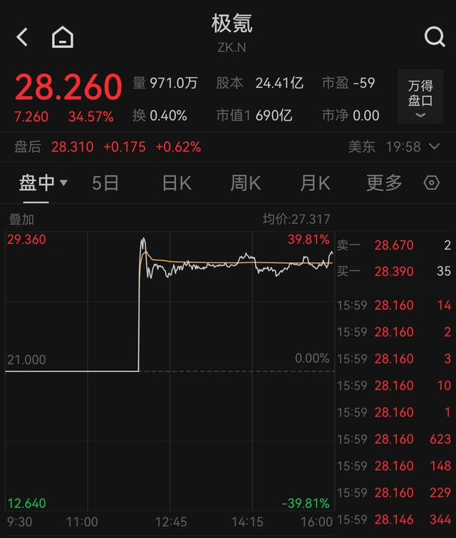 当地时间5月10日,极氪智能科技控股有限公司(下称“极氪”)正式在美国纽交所挂牌上市,股票代码为“ZK”,IPO发行价为每股21美元,位于预期范围最高端。Wind客户端显示,极氪开盘价为26美元/股,首日上涨34.57%,收报于28.26美元/股,市值69亿美元。