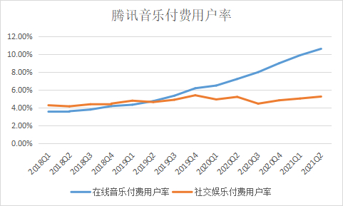 靠的是不断提升的付费用户渗透率。其中,在线音乐付费用户渗透率从2018Q1的8.4%提升至2021Q2的10.63%;社交娱乐付费用户渗透率2018Q1的4.29%提升至2021Q2的5.26%。
