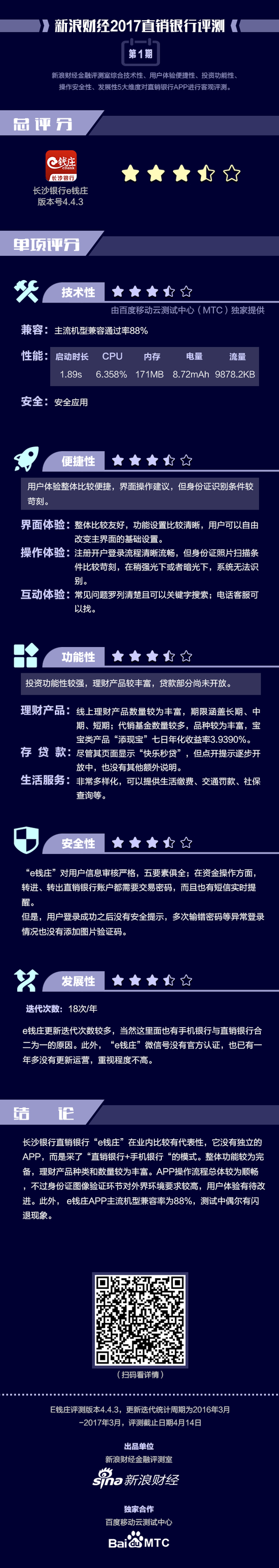 新浪金融评测室合作方“百度移动云测试中心(MTC)”提供的数据显示,长沙银行直销银行“e钱庄”APP主流机型兼容率为88%,测试中出现闪退、卡死等问题;从性能数据来看,“e钱庄”APP启动时长均值为1.89s,高于金融行业平均值; CPU占用均值为6.358%,低于金融行业平均值;电量耗用均值为8.72mAh,高于金融行业平均值;流量耗用均值为 9878.2kb,高于金融行业平均值。