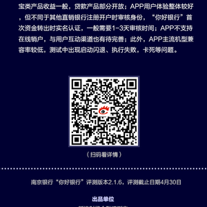 南京银行直销银行“你好银行”APP银行理财产品较为丰富,但宝类产品收益一般,贷款产品部分开放;APP用户体验整体较好,但首次资金转出要等待1-3天,进行实名审核;APP不支持在线销户,与用户互动渠道也有待完善;此外,APP主流机型兼容率较低,测试中出现启动闪退、执行失败,卡死等问题。