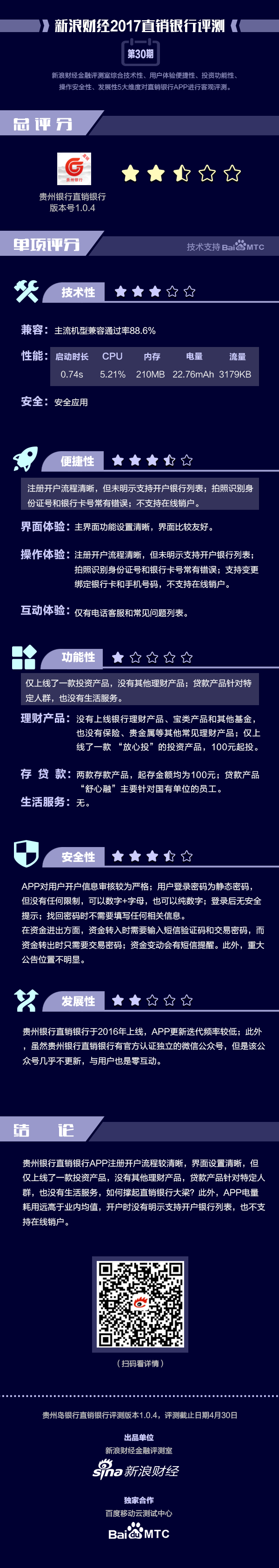 金融评测室综合技术性、用户体验便捷性、投资功能性、操作安全性、发展性5大维度,58余项细分指标对贵州银行直销银行APP进行全扫描,最终给予2.5星评级(最高评级5星)。