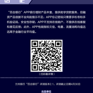 兰州银行直销银行“百合银行”APP银行理财产品丰富,但融资产品信披不全、风险提示不足;APP忘记密码只需要手机号和手机验证码,安全性存疑;不支持在线销户,不提供在线客服和意见反馈;此外,APP性能指标欠佳,电量、流量消耗均值远远高于金融行业平均值。