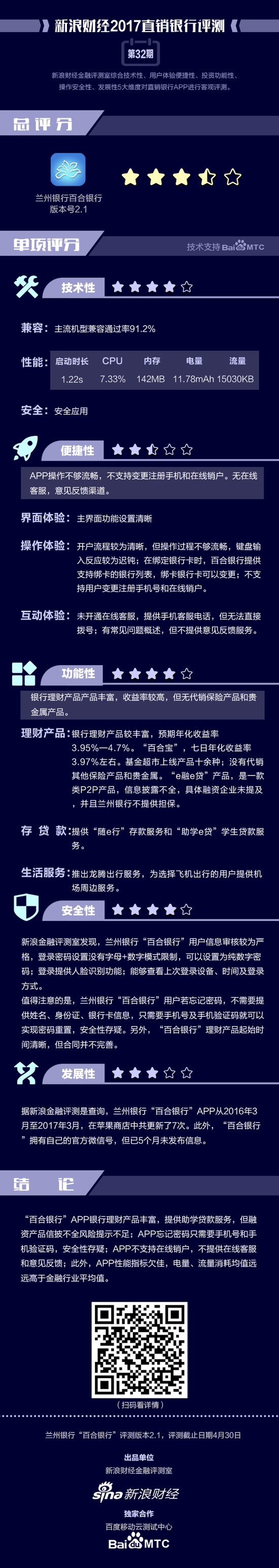金融评测室综合技术性、用户体验便捷性、投资功能性、操作安全性、发展性5大维度,58余项细分指标对兰州银行直销银行APP进行全扫描,最终给予3星半评级(最高评级5星)。