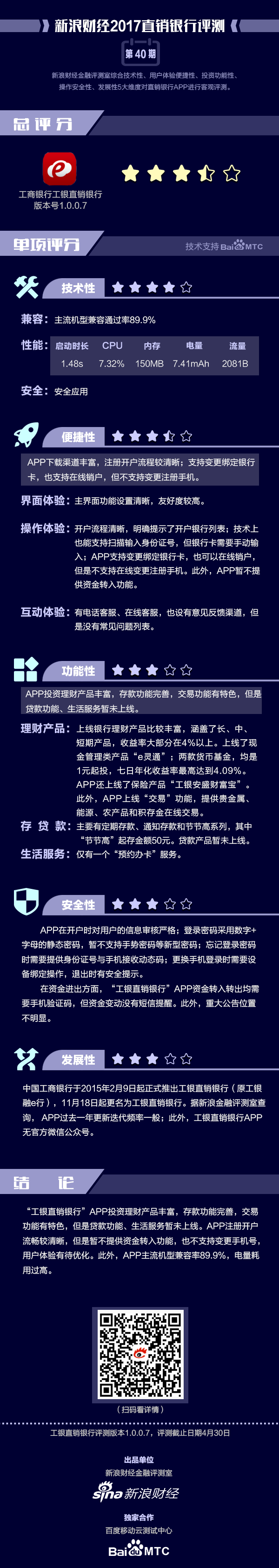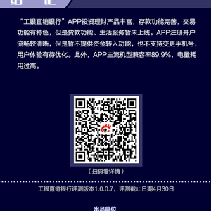 金融评测室综合技术性、用户体验便捷性、投资功能性、操作安全性、发展性5大维度,58余项细分指标对工商银行直销银行“工银直销银行”APP进行全扫描,最终给予3.5星评级(最高评级5星)。