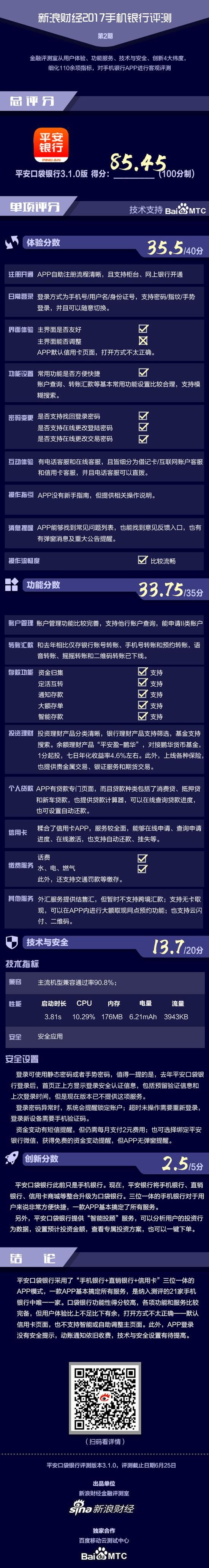 新浪金融评测室合作方“百度移动云测试中心(MTC)”提供的数据显示,“平安口袋银行”APP主流机型兼容率为90.8%,测试中曾出现闪退、卡死、执行失败问题。从性能数据来看,“口袋银行”APP启动时长均值为3.81s,CPU占用均值为10.29%,内存占用均值为176MB,电量耗用均值为6.21mAh,流量耗用均值为3943KB,均高于金融行业平均值。综合技术指标来看,“平安口袋银行”APP为安全应用。