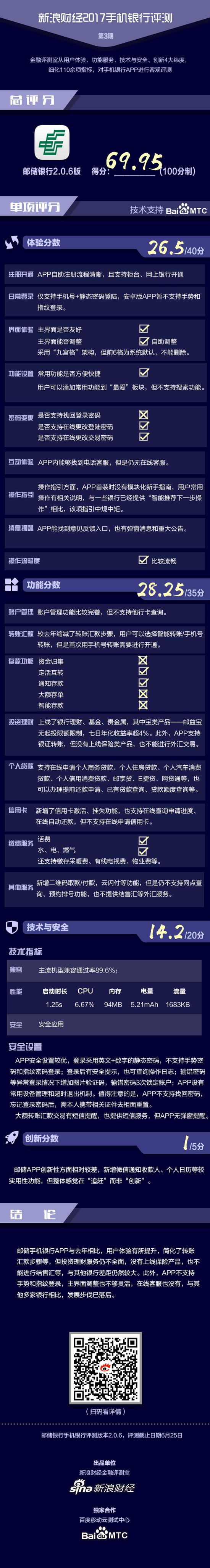 综合而言,邮储APP在功能项评测上得分不高,投资理财服务不够全面,也缺乏特色业务找不到亮点。