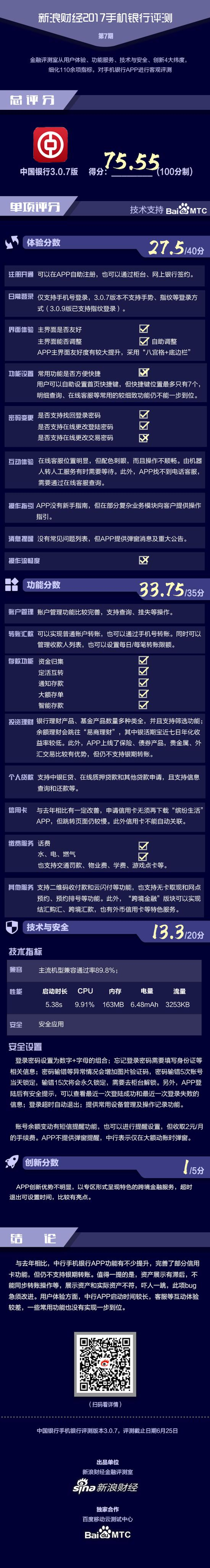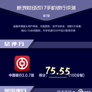 金融评测室综合体验性、功能性、技术与安全性、创新性4大维度,110余项细分指标对中国银行手机银行APP进行全扫描,最终给予75.55分(总分100),中游偏下。