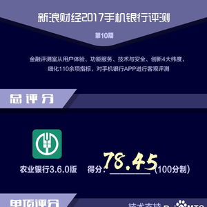 金融评测室综合体验性、功能性、技术与安全性、创新性4大维度,110余项细分指标对农业银行手机银行APP进行全扫描,最终给予78.45分(总分100),排名中游略下。