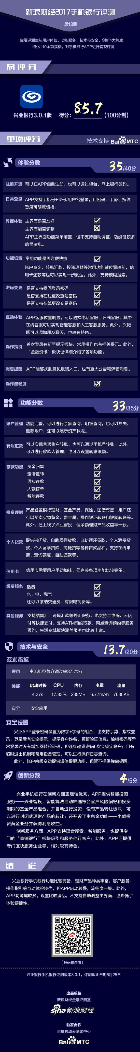 金融评测室综合体验性、功能性、技术与安全性、创新性4大维度,110余项细分指标对兴业银行手机银行APP进行全扫描,最终给予85.7分(总分100),排名居前。