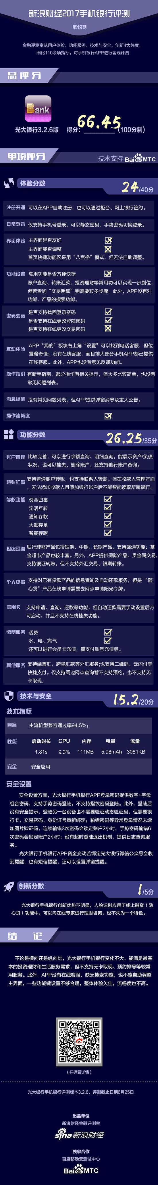 金融评测室综合体验性、功能性、技术与安全性、创新性4大维度,110余项细分指标对光大手机银行APP进行全扫描,最终给予66.45分(总分100),排名下游。