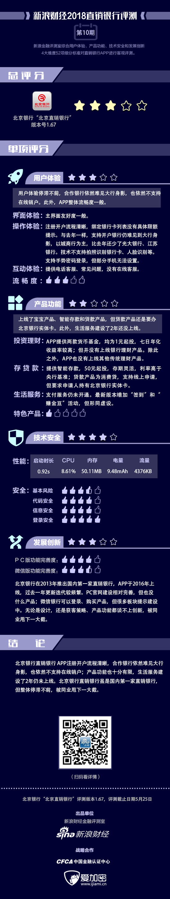 金融评测室综合用户体验、产品功能、技术安全、发展创新4大维度,52余项细分指标对北京直销银行APP进行全扫描,最终给予3星评级(最高评级5星)。