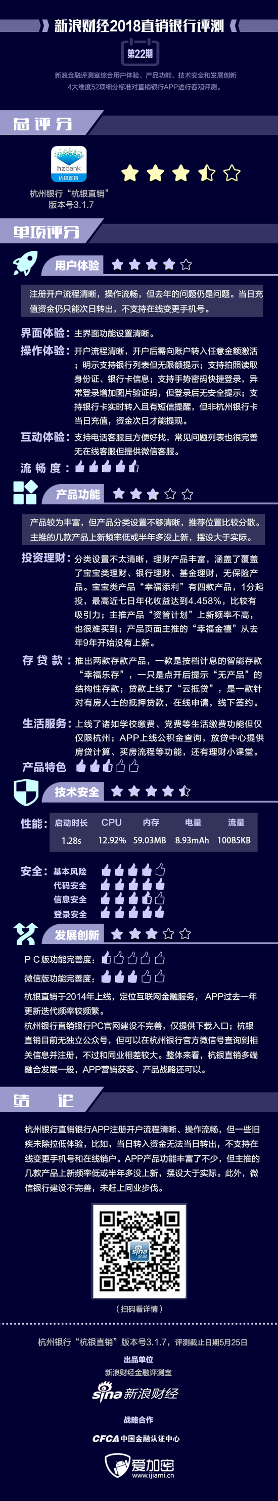 金融评测室综合用户体验、产品功能、技术安全、发展创新4大维度,52余项细分指标对杭州银行“杭银直销”APP进行全扫描,最终给予3.5星评级(最高评级5星)。