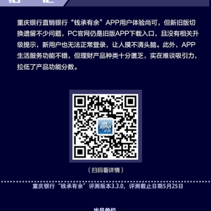 总体而言,重庆银行直销银行APP注册开户流程较清晰,用户体验尚可,但新版升级留下尾巴,突出表现是官方网站仍是旧版下载入口,给新用户造成一定认知困难。此外,APP不支持在线销户也是一大遗憾。