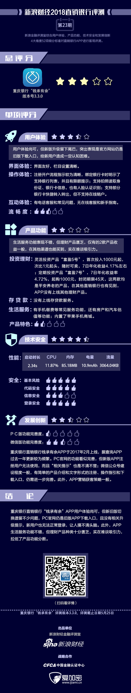 金融评测室综合用户体验、产品功能、技术安全、发展创新4大维度,52余项细分指标对重庆银行“钱承有余”APP进行全扫描,最终给予3星评级(最高评级5星)。